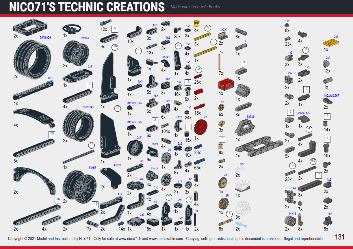 As a B model, I have of course created the instructions, which are step by step high resolution computer generated instructions 300DPI for 132 pages, with partlist, flexible parts, white edge on dark parts, highlighted parts for each step (you can see preview in the galley below). Regarding the bill of material, as an alternate model, if you own the #42127 Lego set, you have all the needed parts. But you can checked the exact bill of material on Rebrickable and export in whatever format you want. The picturing bill of material are also visible in the instruction previews and included in the instructions.