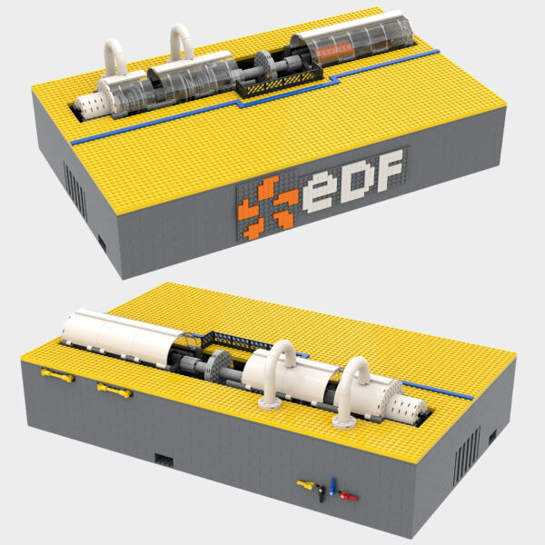 The second massive commissioned project was for EDF, the biggest French electricity producer, so that was quite an achievement to work for them ! The model is a 64cm wide replica of a turbo generator concept. The machine is motorized by multiple motors with different gearboxes and differentials, and is instrumented using divers sensors, while the rotor drives different motors in generator mode. It is used in fundamental research to develop a Digital Twin, by simulating and studying the machine in different functioning scenario (mechanically, electrically, vibrating) which are controlled mechanically by the colored levers.