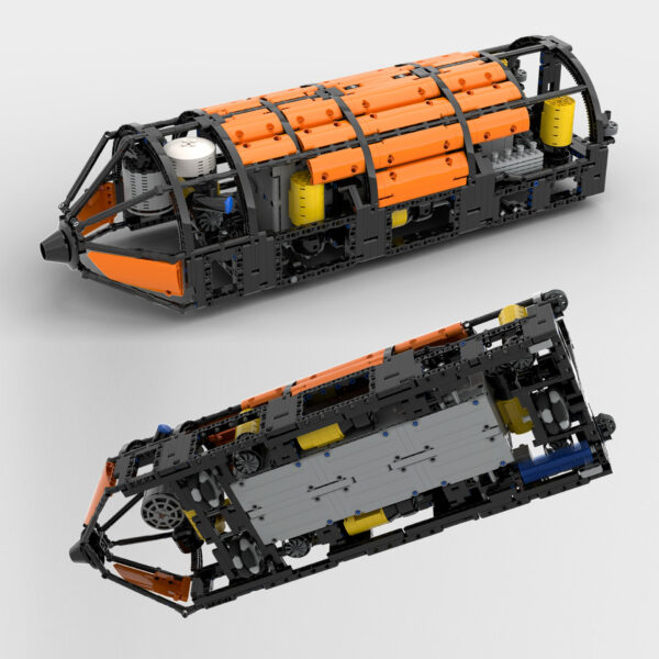 The first commissioned project was a 1/2 scale Pipe Inspection Robot, measuring 60cm long, with motorized functions using a BuWizz. The 8 propellers are powered, and the internal core can be removed from the black cage. The difficulty here was the integration of all the electronic and gears inside the core, as well as the exterior shape. Fun fact, this model is equipped with omniwheels from Robot Shop as real.