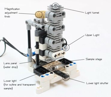 A LEGO Technic working microscope using a water drop for magnification, with dual light with down shutter.