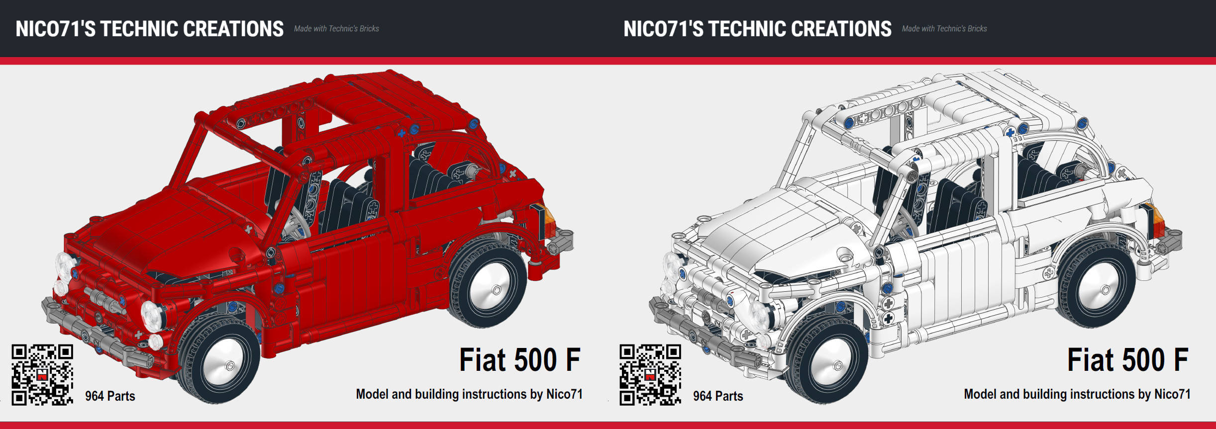 You can purchase either the creations on the website Buildamoc including the Lego genuine parts and building instructions in PDF, or just the building instructions on nico71.fr. Available in two colors : red and white.