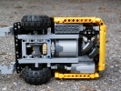 The aim was to built the smallest forklift features all functions. A XL motor drives the front wheels with a 8/24 and 20t on differential. The use of new frame enable to have a strong building, without creaking sounds. The steering is operated by a M-motor, with a worm gear and clutch. I have chosen the single steering wheel in order to have a very small construction. Therefore, the frame measures 12cmx17cm. The tilting of the fork is operated by a M-motor with worm gear and a clutch. The fork is build on a variation of the fork of the 8416 set. Mine raises the fork at 24cm. I have tried to keep in mind to have a good design with yellow panels and I think I succeed, the forklift truck is small and very playable.