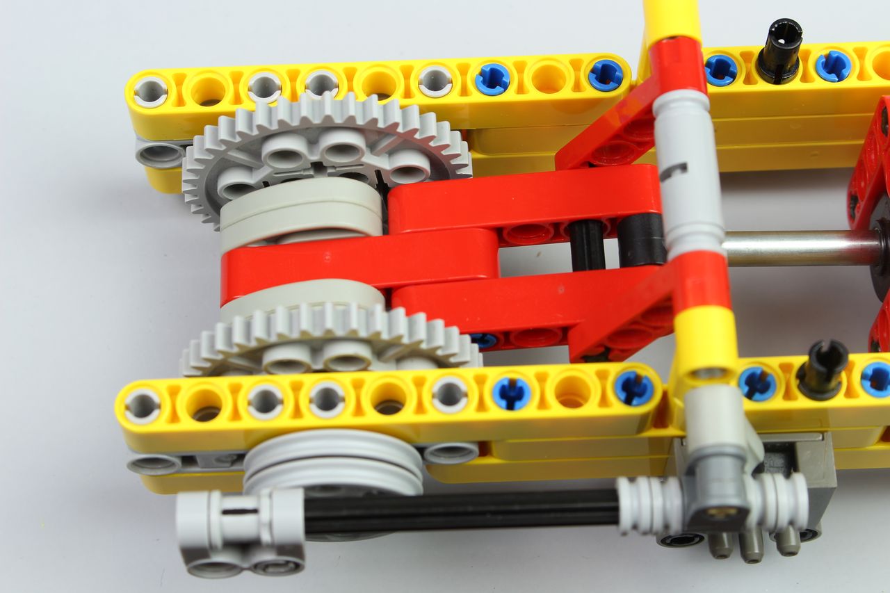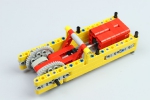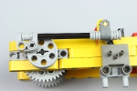The trolley is powered by a lever with connecting rod, which makes move the trolley back and forth on the yellow rail. On the top on the rail, the trolley comes against a liftarm which forces it to rotate and then release the ball and the process is repeated again and again.