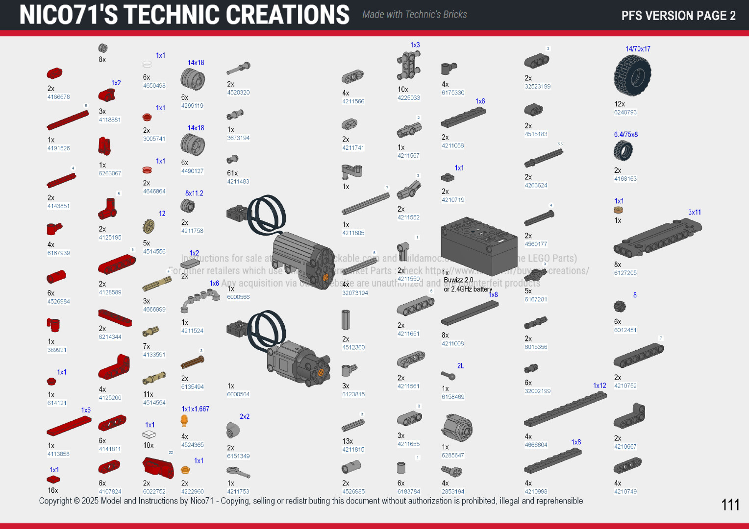 • In Power Functions System : 1x BuWizz 2.0 and a compatible smartphone (PDF tutorial included), or a generic PFS 2.4ghz Battery Emitter and Receiver (Cada, Mouldking or other Chinese brand) or legacy PFS infrared system (8881+58123a+8885)