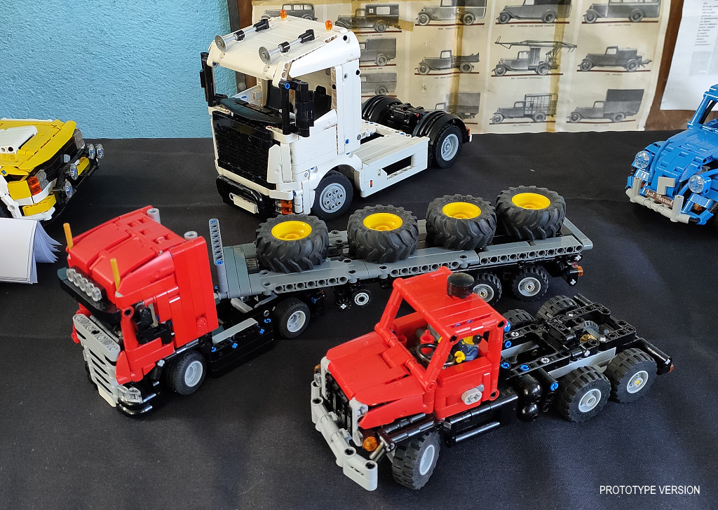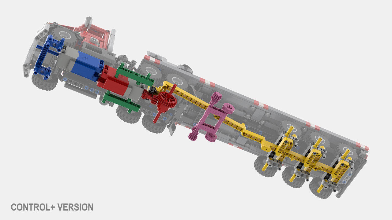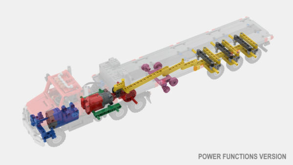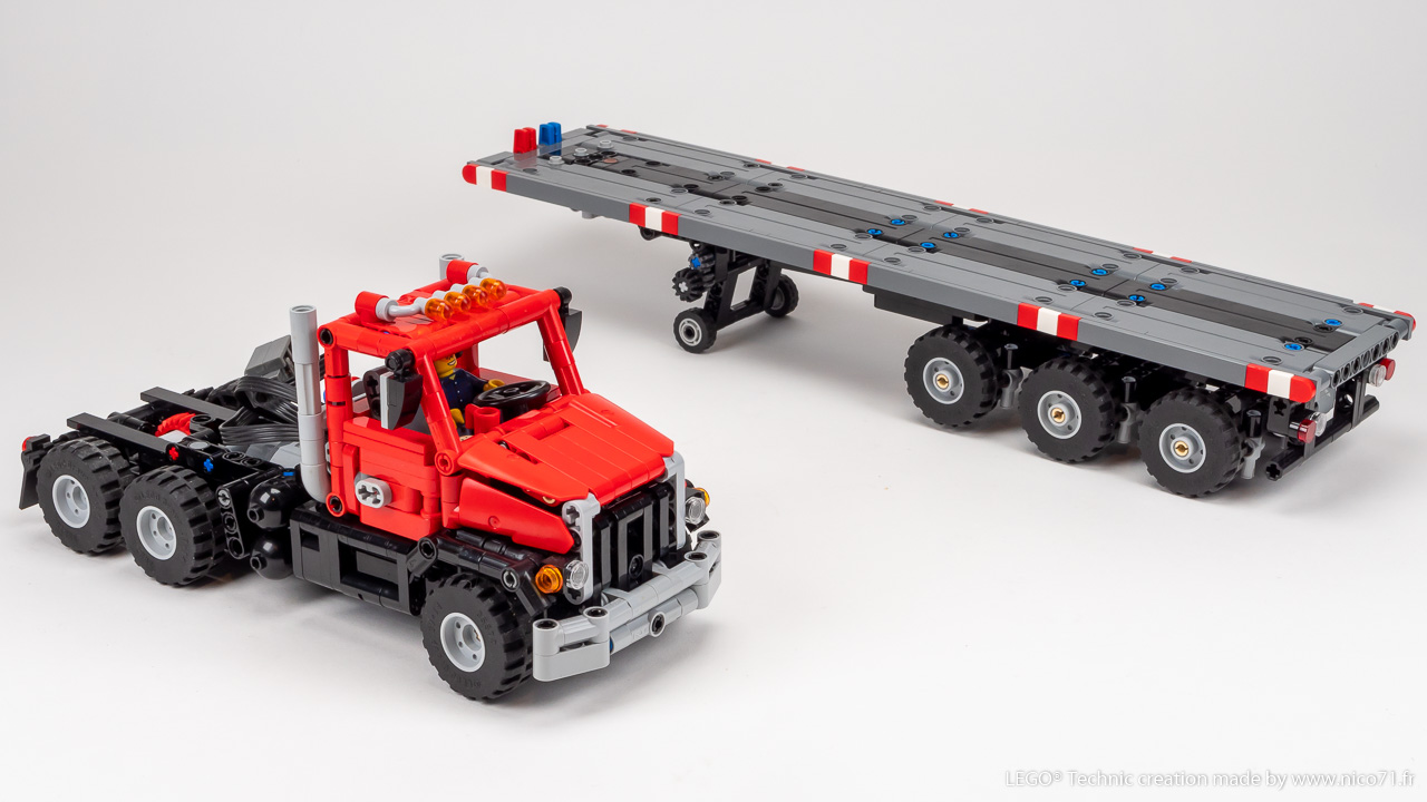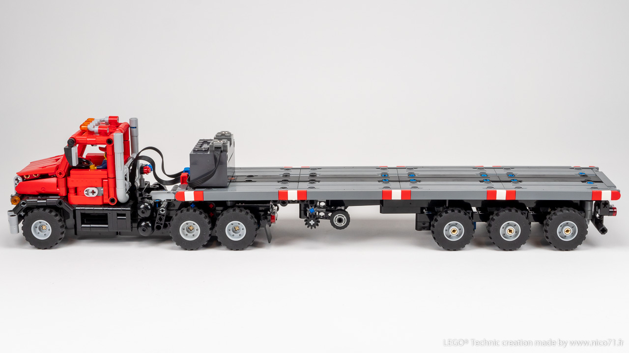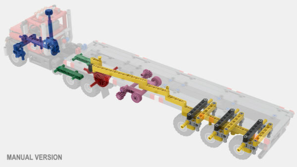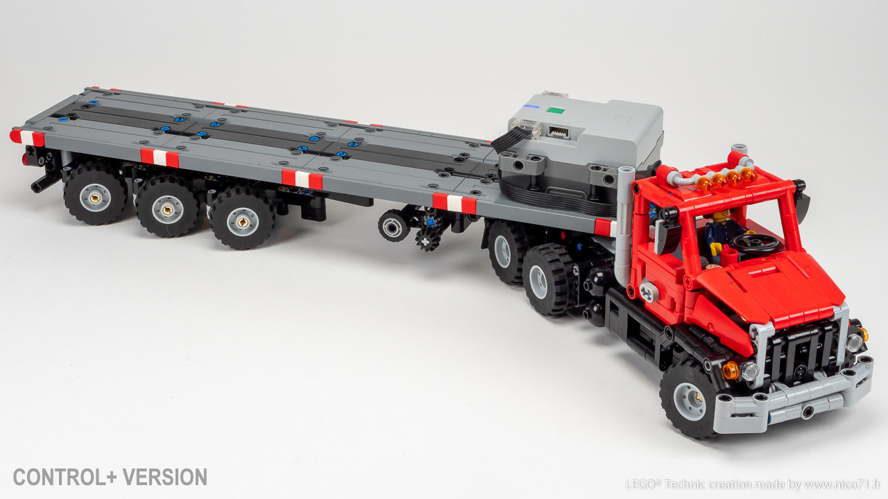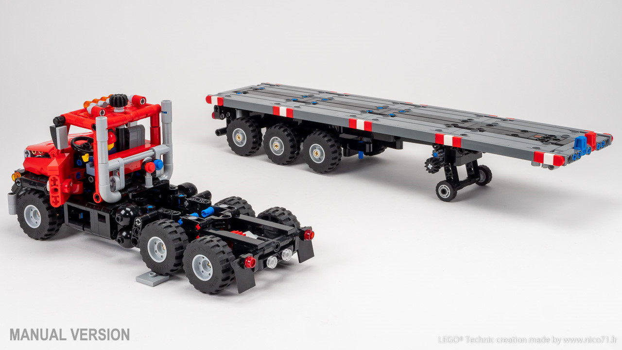 A 1/30 LEGO Technic replica of an American Heavy Duty Truck with Steering Axle Trailer. Features drive, steering and tri-axle trailer with fixed or steerable axle. Available in different motors configurations (Manual, PFS, Control+) in a single download, all upgradable.