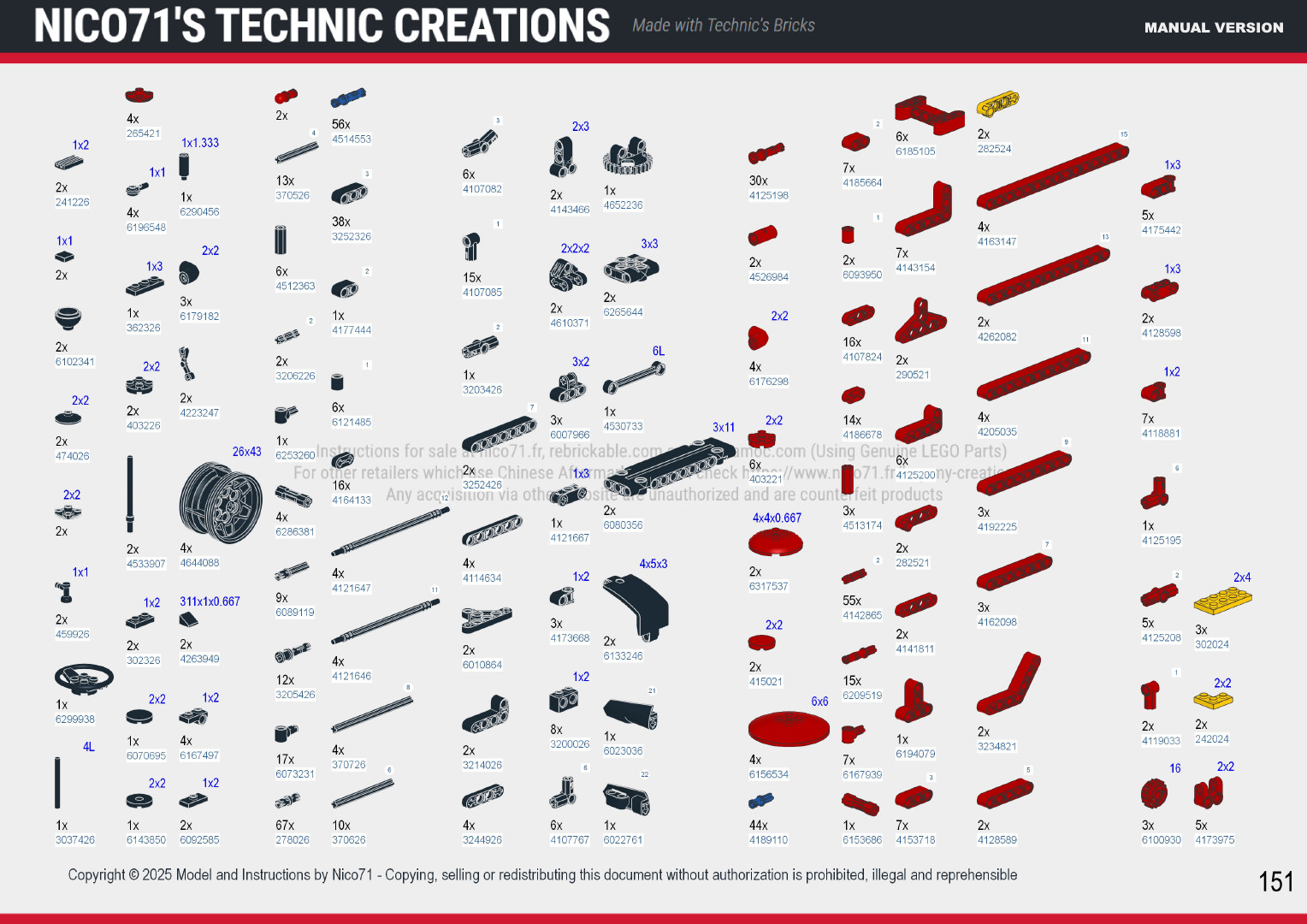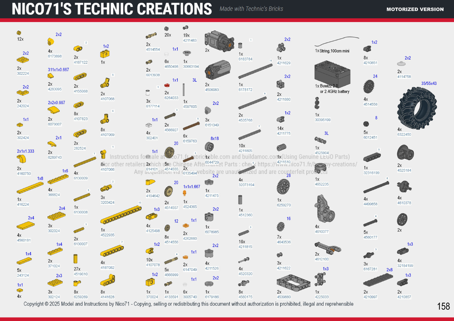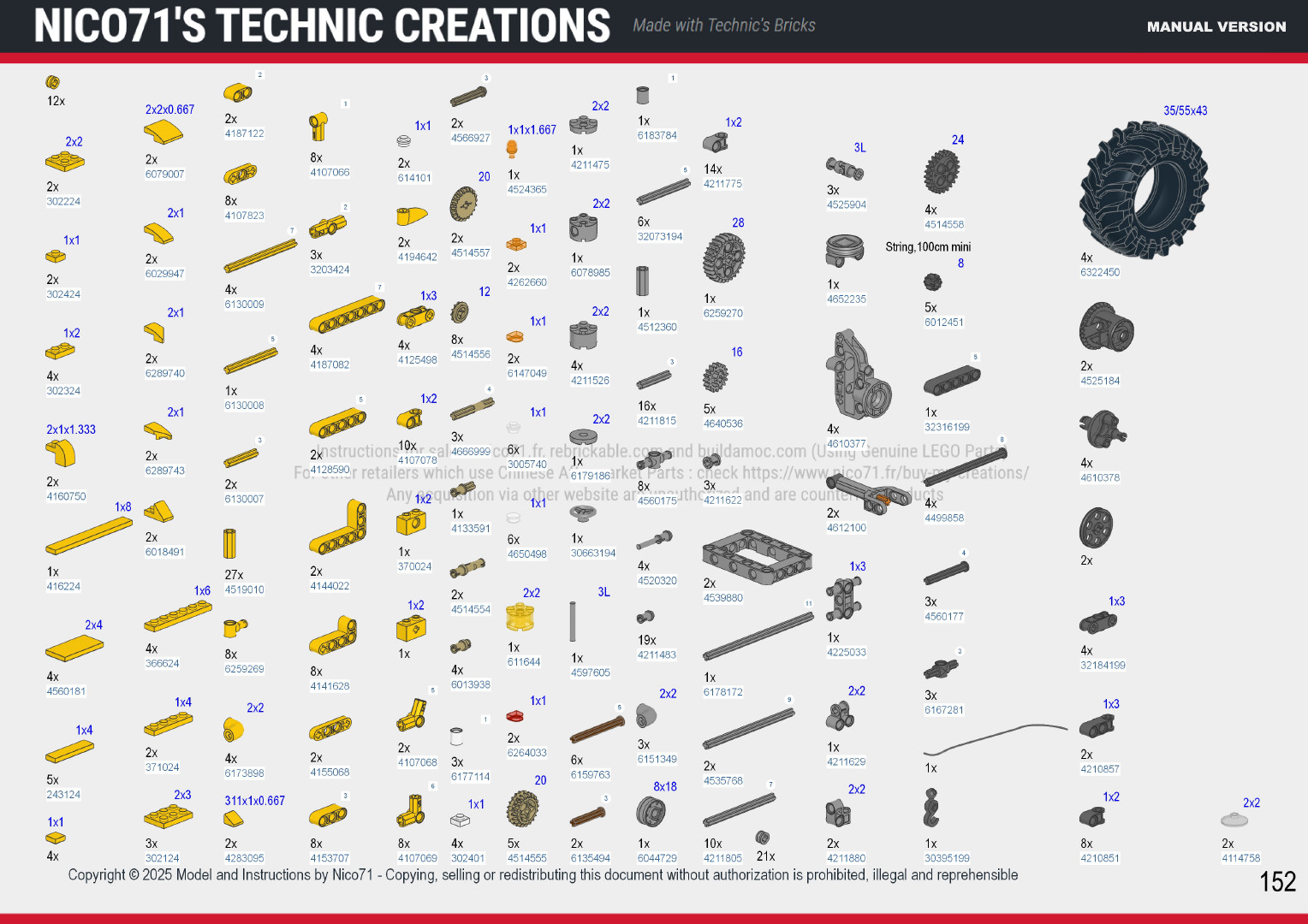📕 You only need the parts and the instructions. You can purchase the PDF instructions on this shop (two versions included) and build with your own parts (you can build the manual version, then upgraded later by adding the motors and battery/remote). The Rebrickable inventory included the parts to build the two versions). See the end preview below to see the difference.