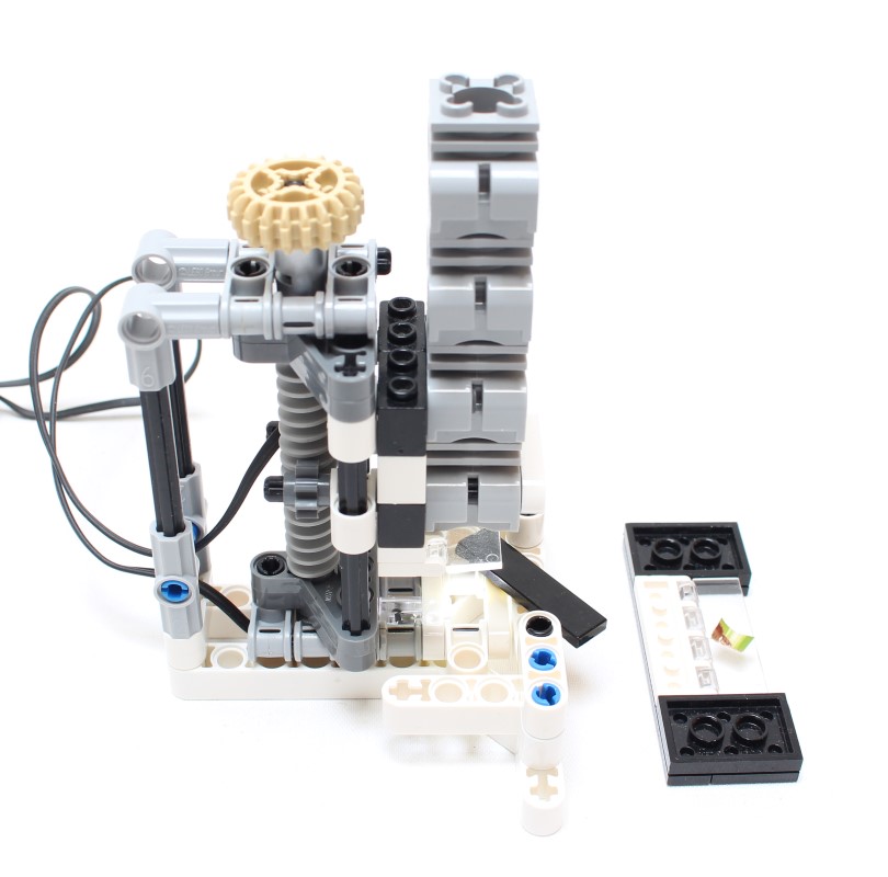 A LEGO Technic working microscope using a water drop for magnification, with dual light with down shutter.